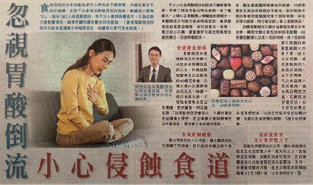 食無定時及作息混亂為都市人常見的不當習慣,而這些看似平常的習慣,長期下去會增加胃酸倒流的風險。數據指大概每10人,就有1至2人有胃酸倒流,惟不少人輕視其嚴重性,以為此病只會影響胃部。腸胃肝臟科專科醫生何佳鈿指,「嚴重胃酸倒流同時可引起食道潰瘍及哮喘等症狀,持續惡化更可致食道癌。」